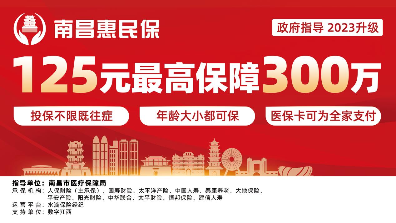 2月23日,2023年“南昌惠民保”正式面向全市基本医保参保人开放。每人只需125元/年,即可享受最高300万元保障,不限年龄、职业、健康情况,一张医保卡可为全家投保。